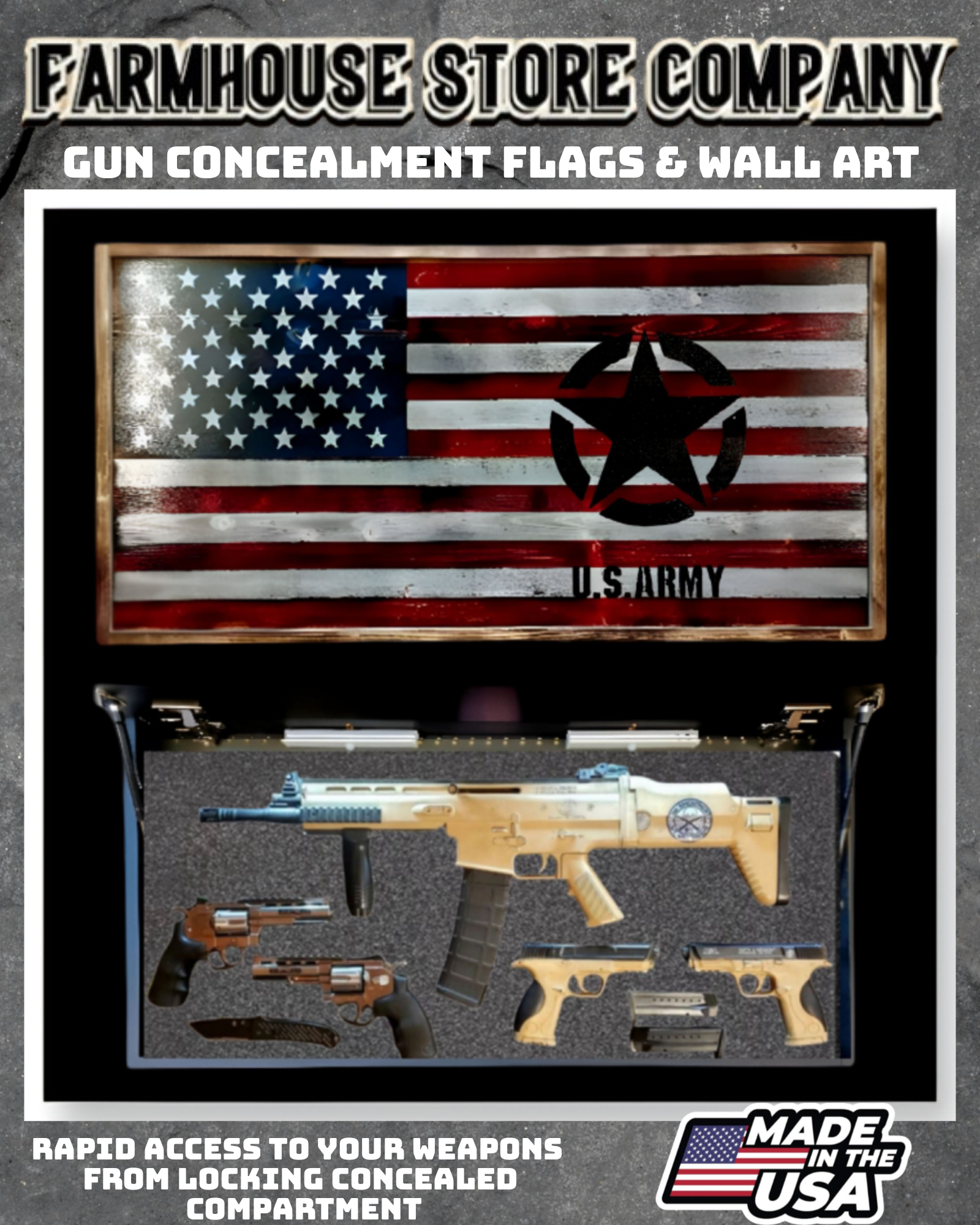 Complete secure concealment of your primary home defense weapons behind an amazing piece of American made Patriotic Decor . This premium Concealment Flag Wall Art keeps your weapons safely out of sight and available within a moment's notice when necessary.