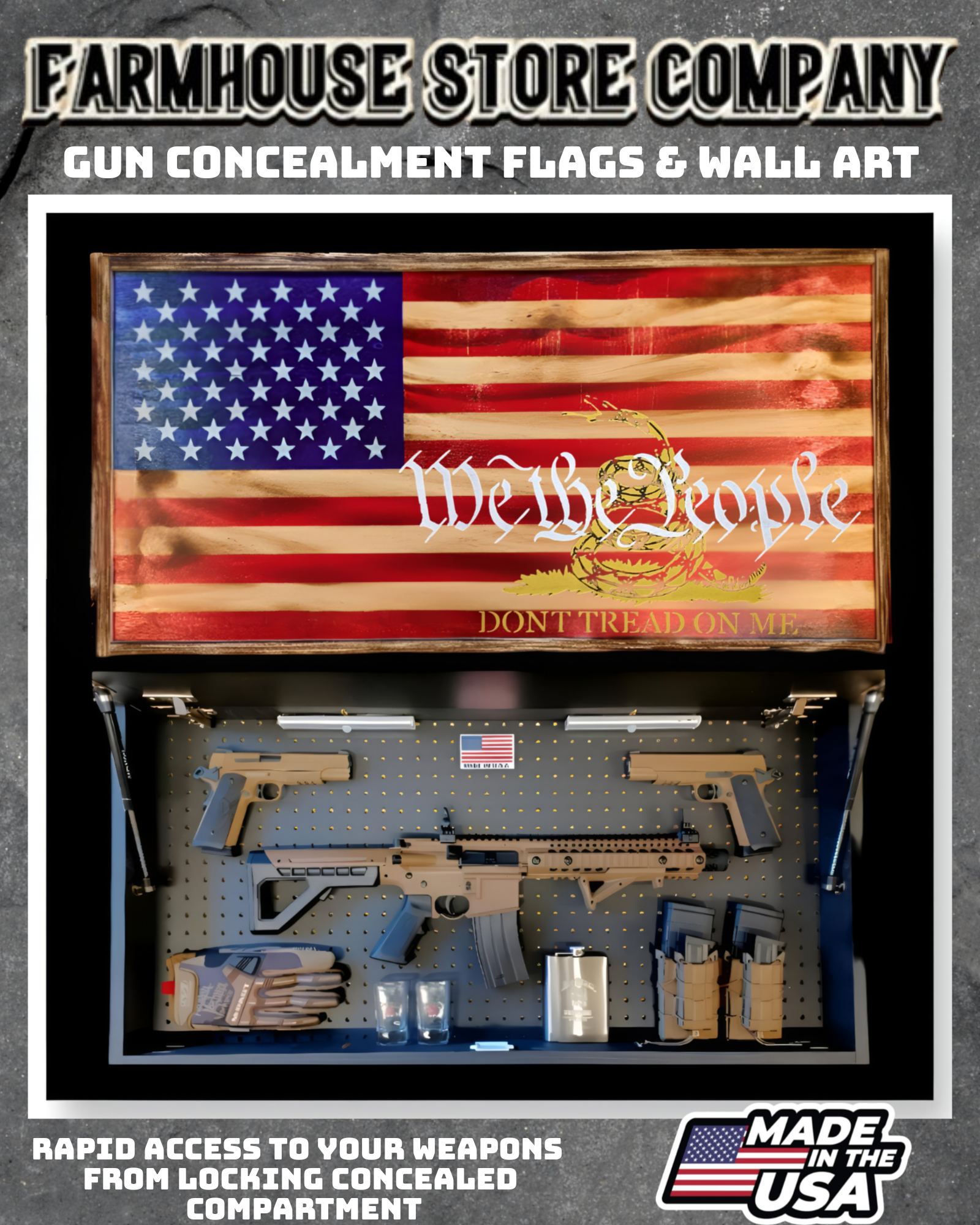 Complete secure concealment of your primary home defense weapons behind an amazing piece of American made Patriotic Decor . This premium Concealment Flag Wall Art keeps your weapons safely out of sight and available within a moment's notice when necessary.