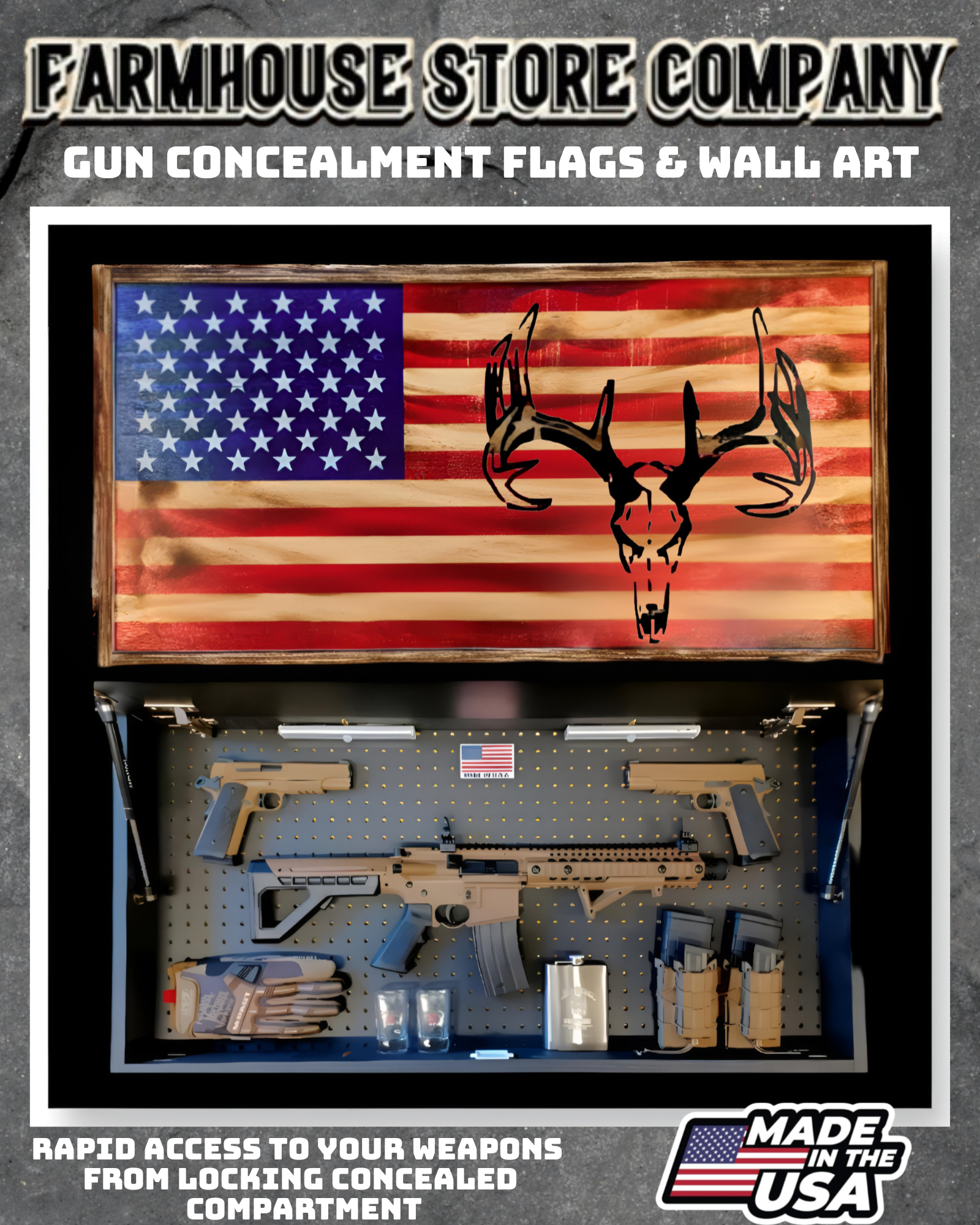 Complete secure concealment of your primary home defense weapons behind an amazing piece of American made Patriotic Decor . This premium Concealment Flag Wall Art keeps your weapons safely out of sight and available within a moment's notice when necessary.