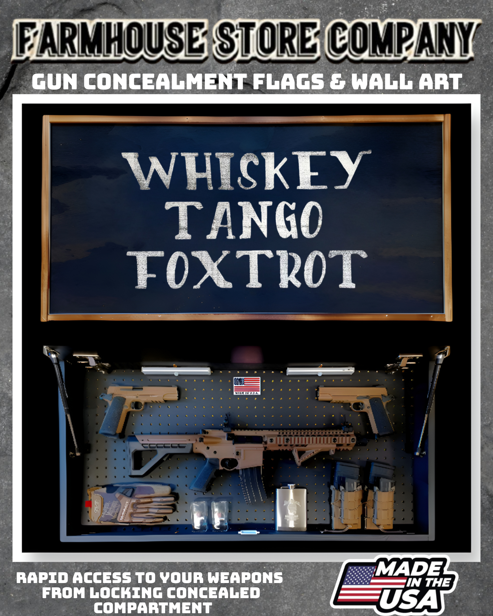 Complete secure concealment of your primary home defense weapons behind an amazing piece of American made Patriotic Decor . This premium Concealment Flag Wall Art keeps your weapons safely out of sight and available within a moment's notice when necessary.