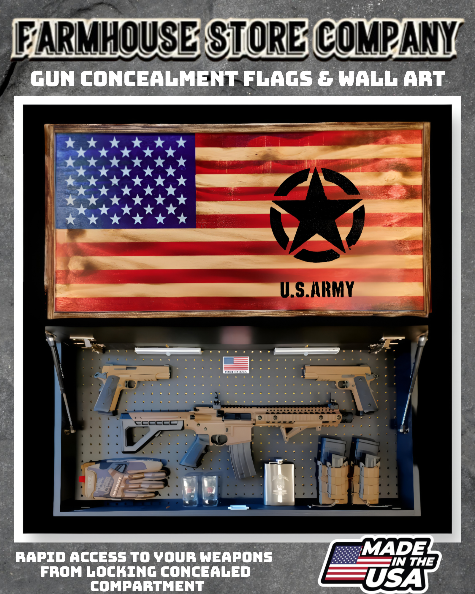 Complete secure concealment of your primary home defense weapons behind an amazing piece of American made Patriotic Decor . This premium Concealment Flag Wall Art keeps your weapons safely out of sight and available within a moment's notice when necessary.
