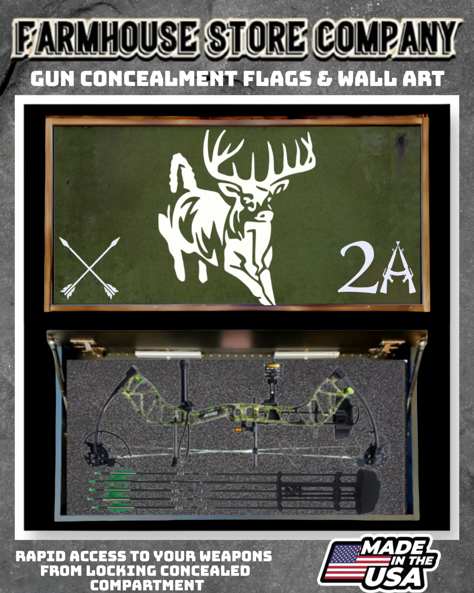 • Load image into Gallery viewer, Gun & Bow Concealment Flag Deluxe Wall Art BATTLE-WORN OD GREEN Running Buck 2A Design