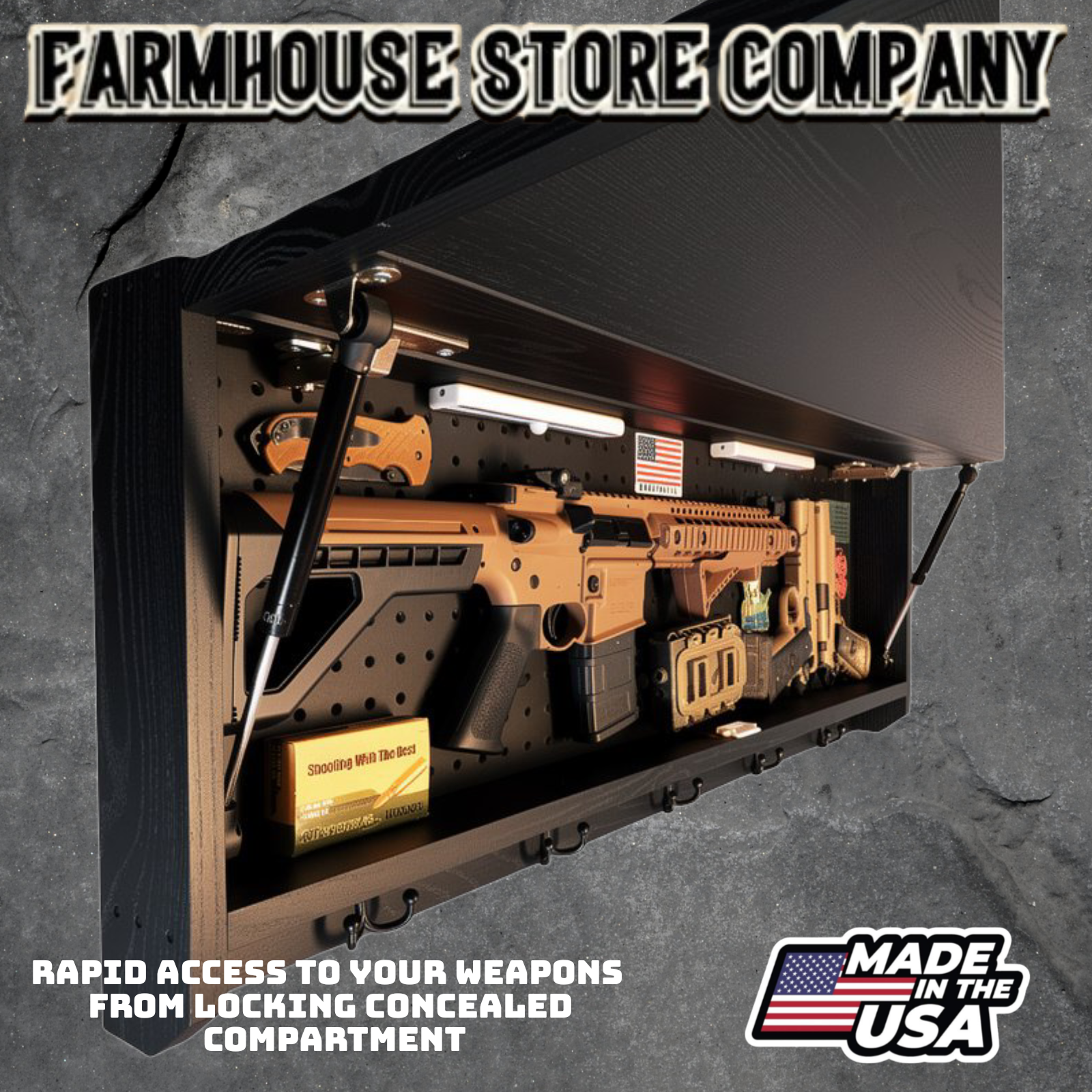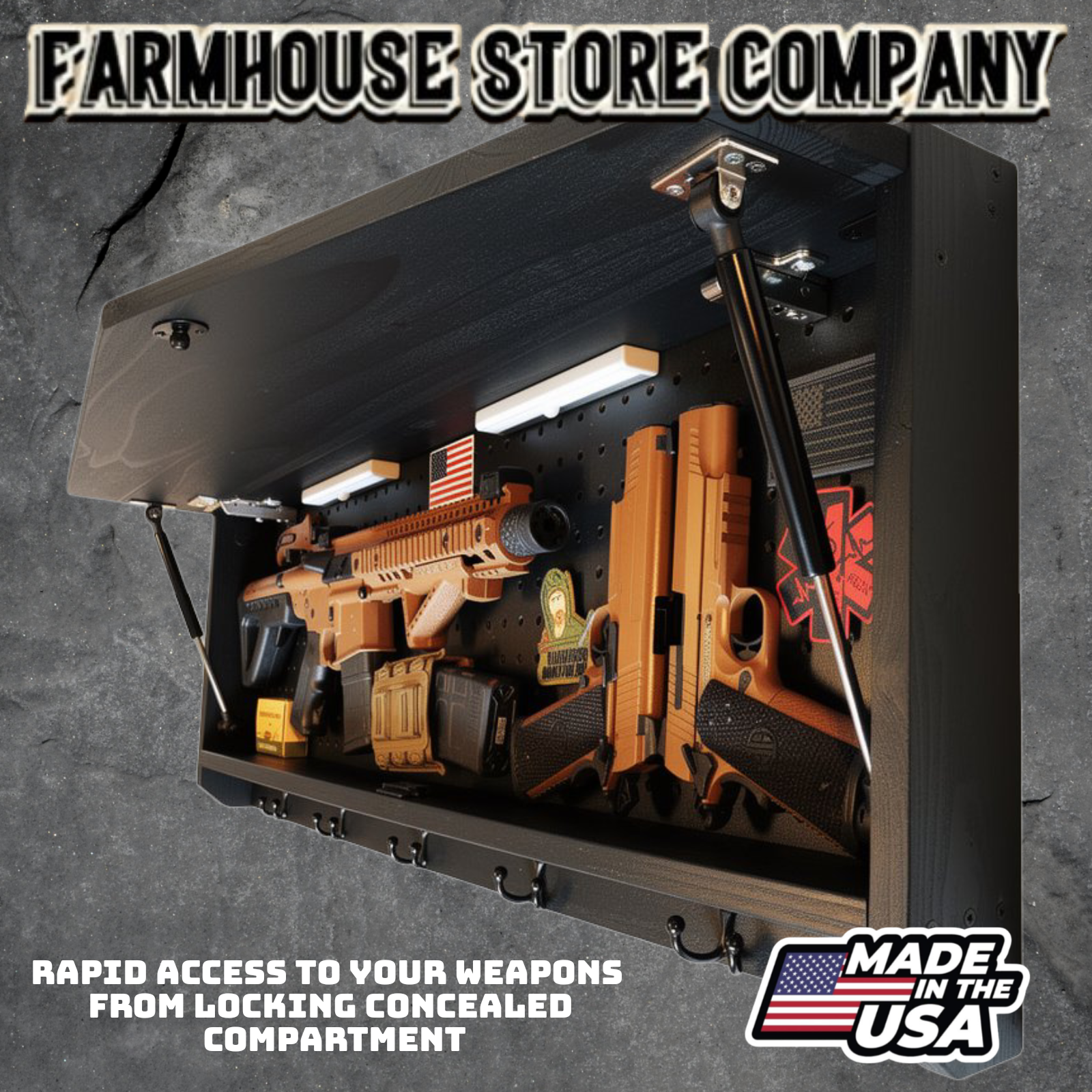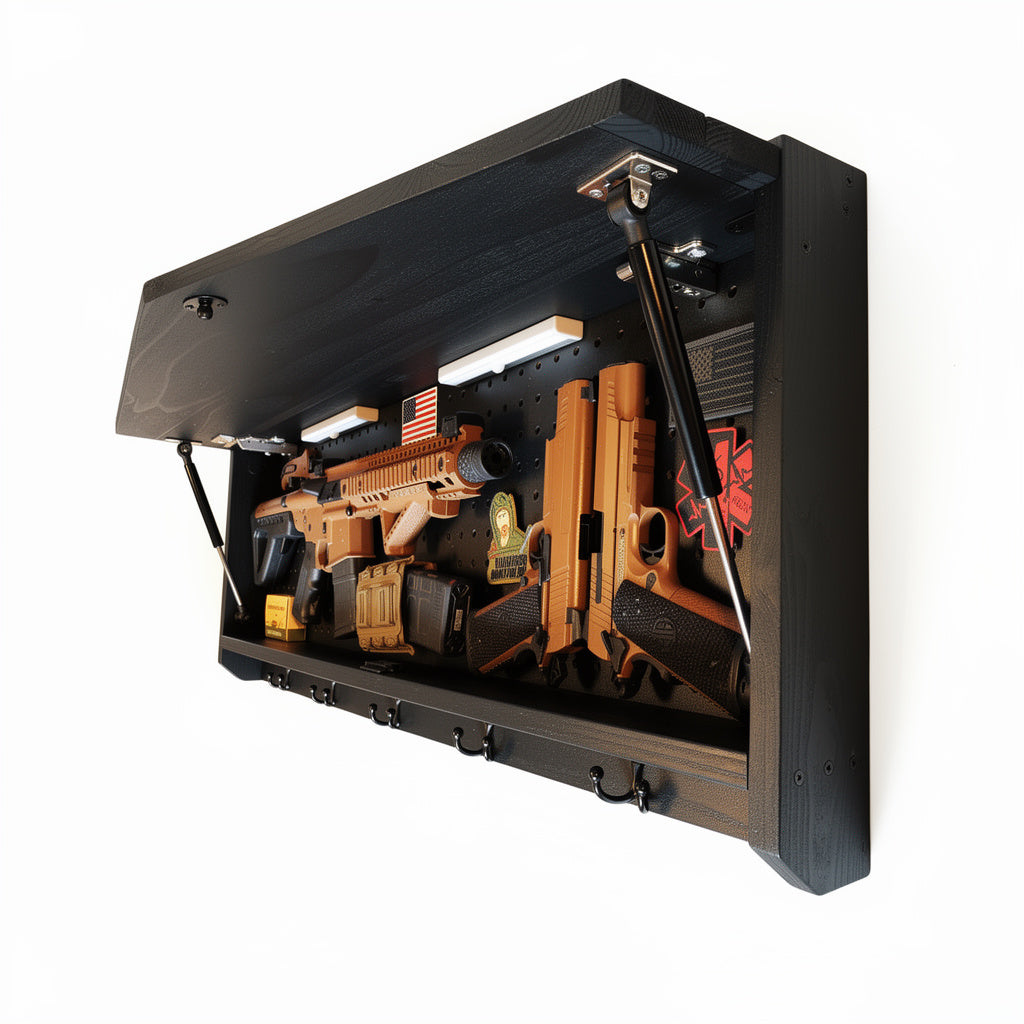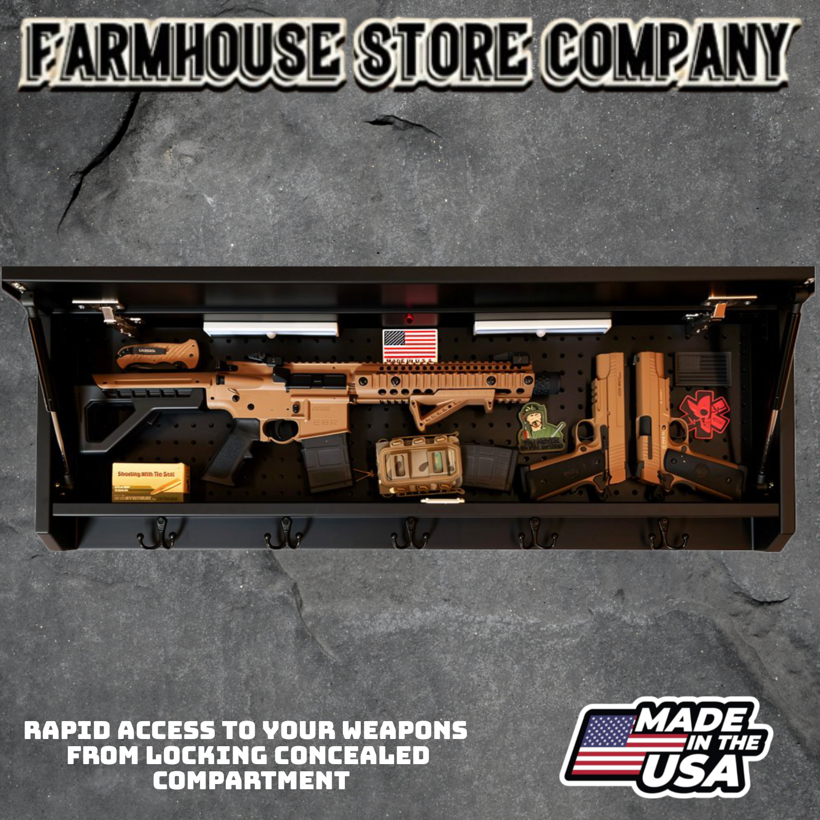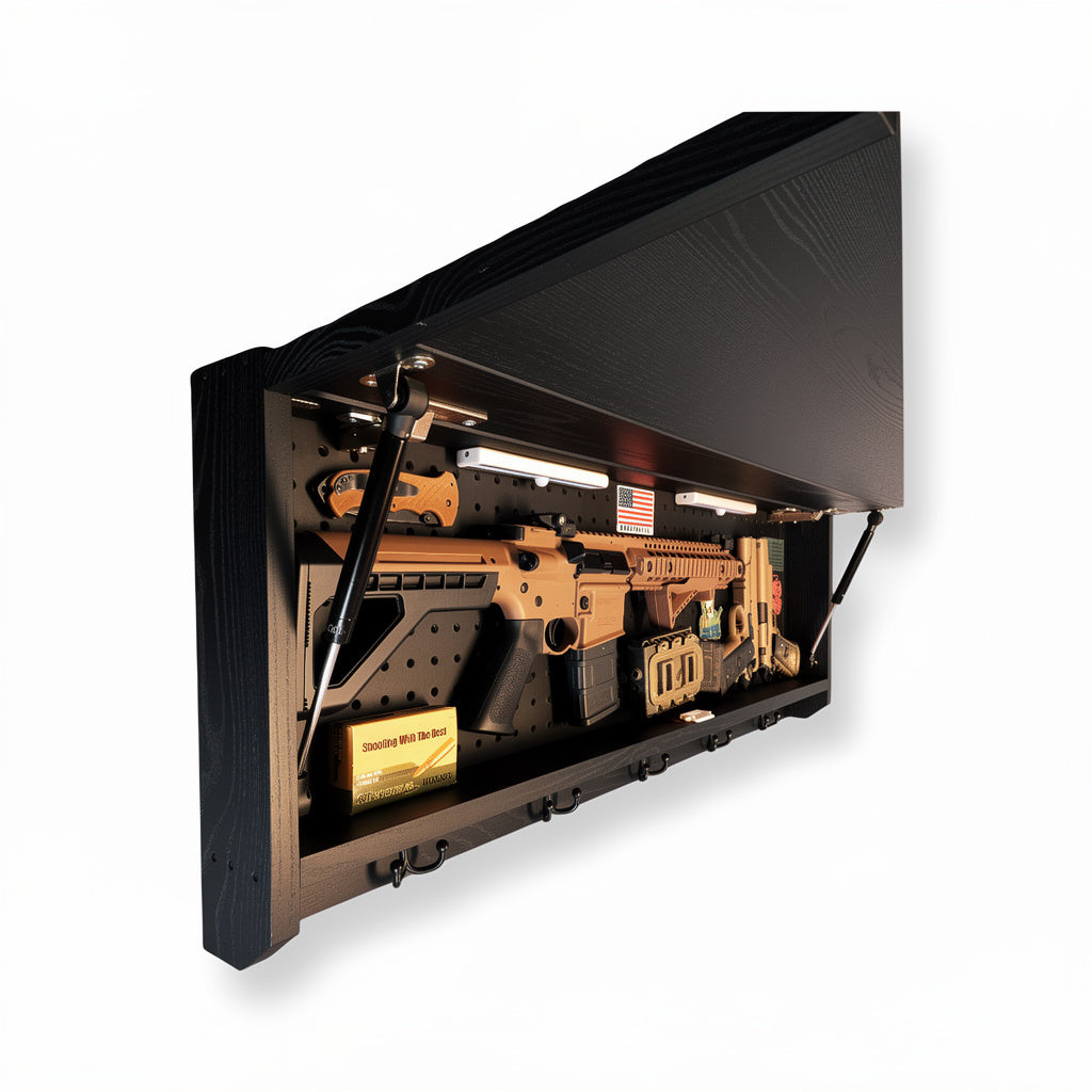 Complete secure concealment of your primary home defense weapons behind an amazing piece of American made Patriotic Decor . This premium Concealment Coat Rack keeps your weapons safely out of sight and available within a moment's notice when necessary, while also holding coats, hats, & all of your gear.