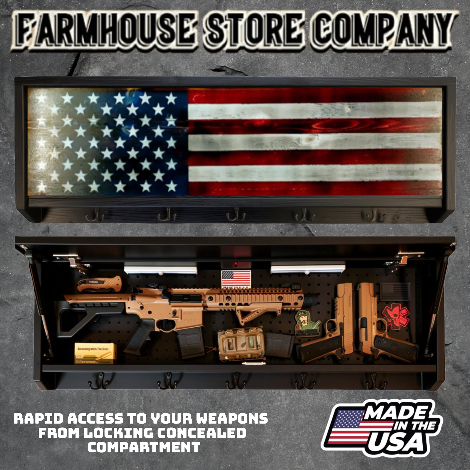 Complete secure concealment of your primary home defense weapons behind an amazing piece of American made Patriotic Decor . This premium Concealment Coat Rack keeps your weapons safely out of sight and available within a moment's notice when necessary, while also holding coats, hats, & all of your gear.