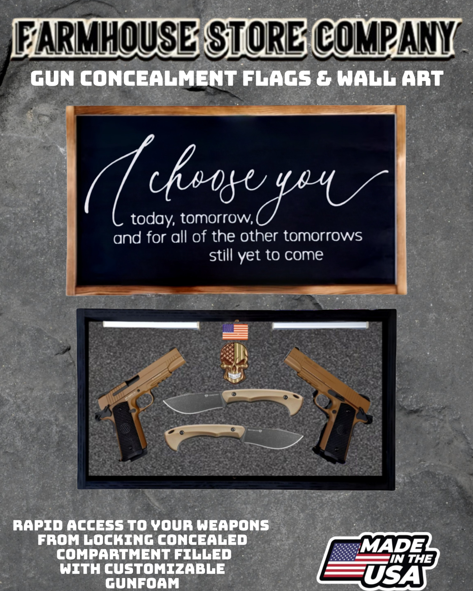 Complete secure concealment of your primary home defense weapons behind an amazing piece of American made Patriotic Decor . This premium Concealment Flag Wall Art keeps your weapons safely out of sight and available within a moment's notice when necessary.