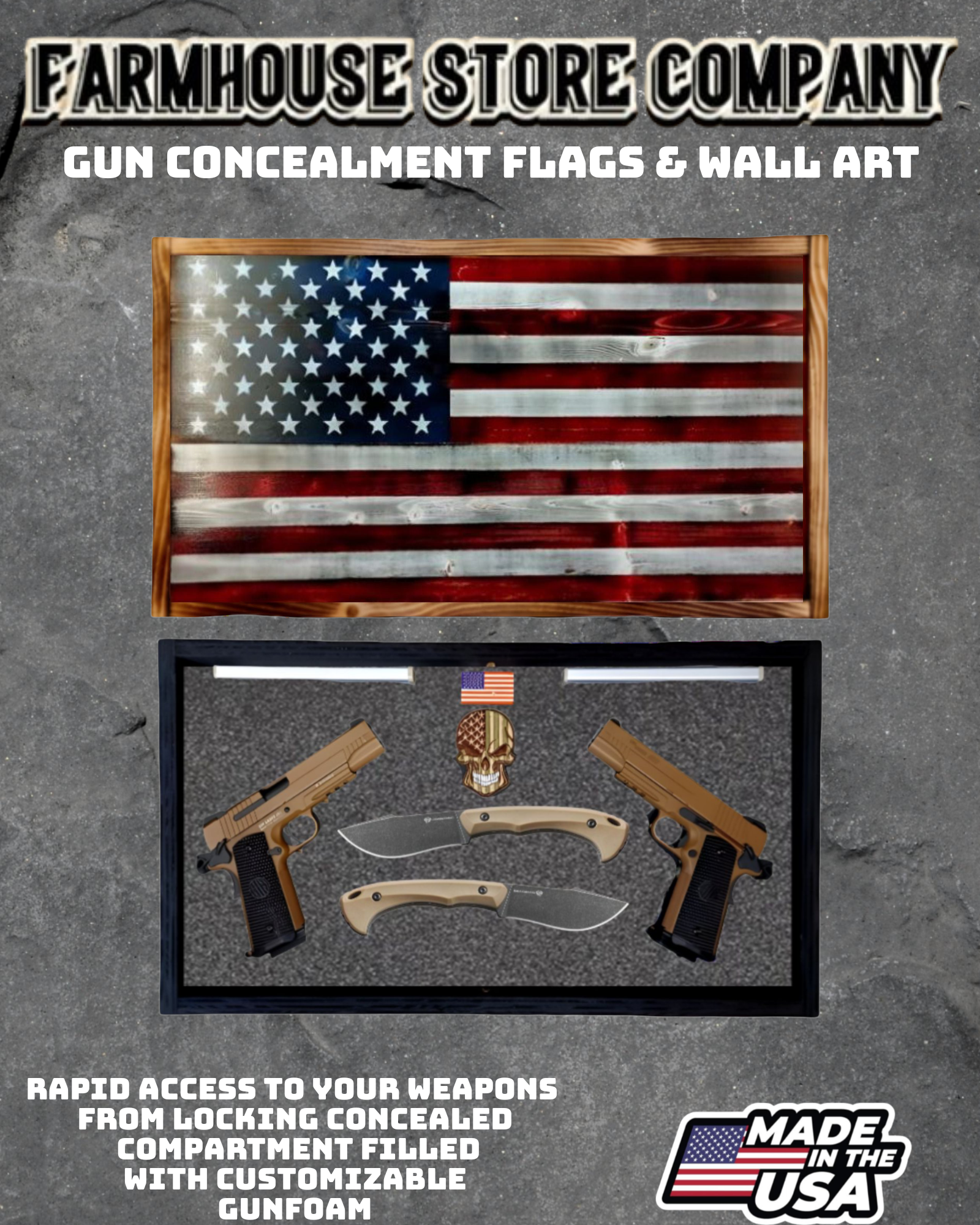 Complete secure concealment of your primary home defense weapons behind an amazing piece of American made Patriotic Decor . This premium Concealment Flag Wall Art keeps your weapons safely out of sight and available within a moment's notice when necessary.