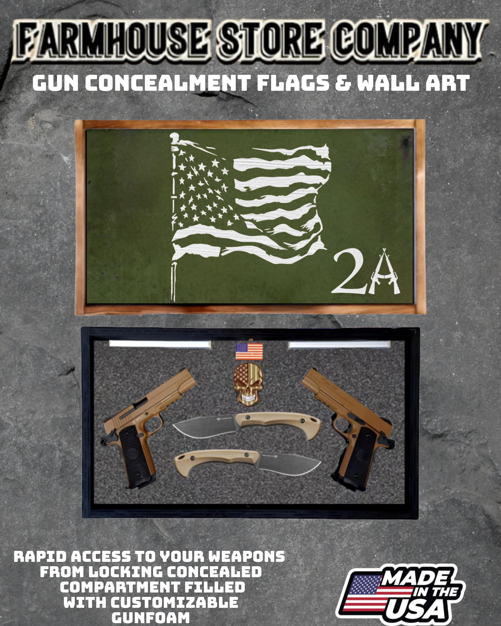 Complete secure concealment of your primary home defense weapons behind an amazing piece of American made Patriotic Decor . This premium Concealment Flag Wall Art keeps your weapons safely out of sight and available within a moment's notice when necessary.