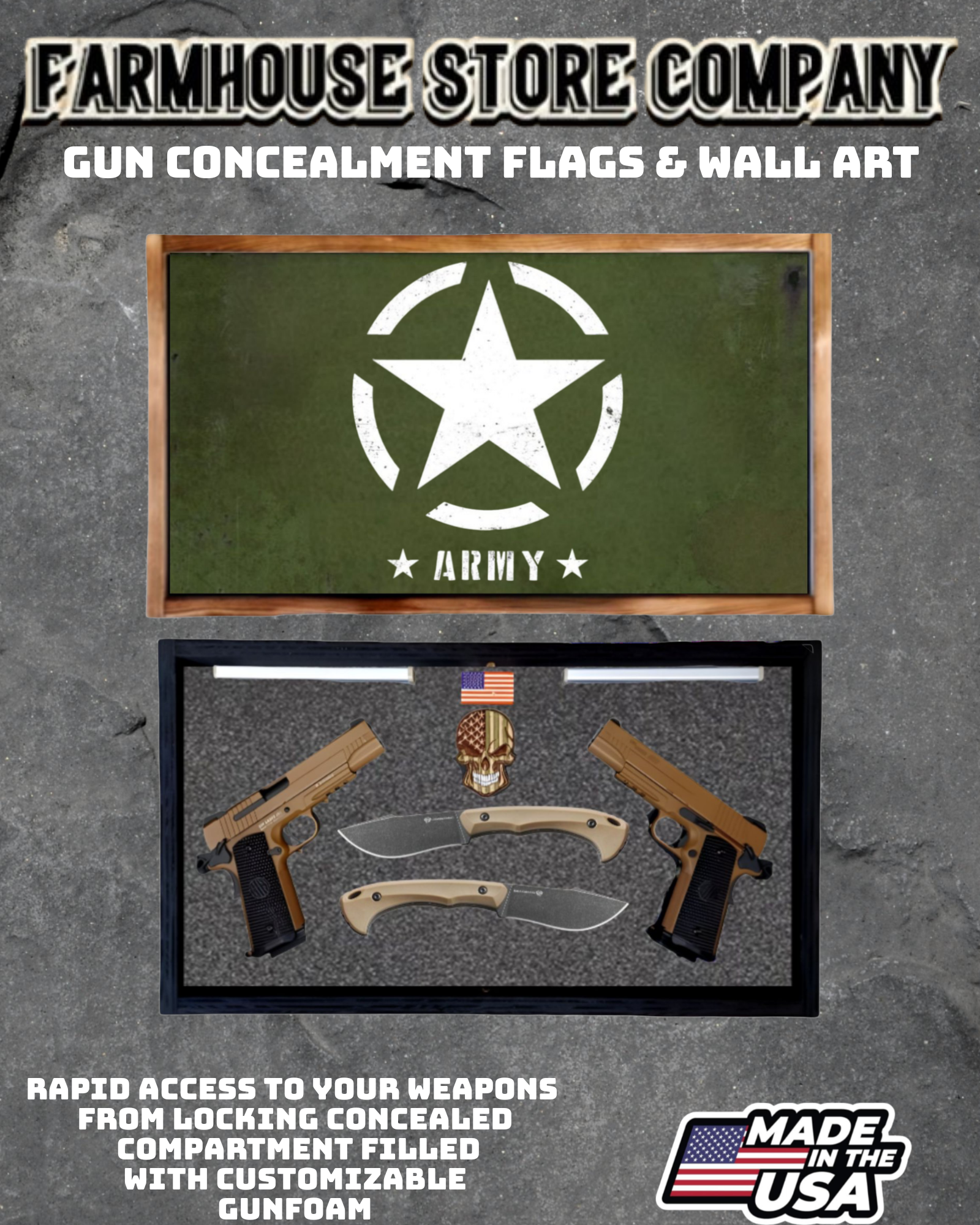 Complete secure concealment of your primary home defense weapons behind an amazing piece of American made Patriotic Decor . This premium Concealment Flag Wall Art keeps your weapons safely out of sight and available within a moment's notice when necessary.