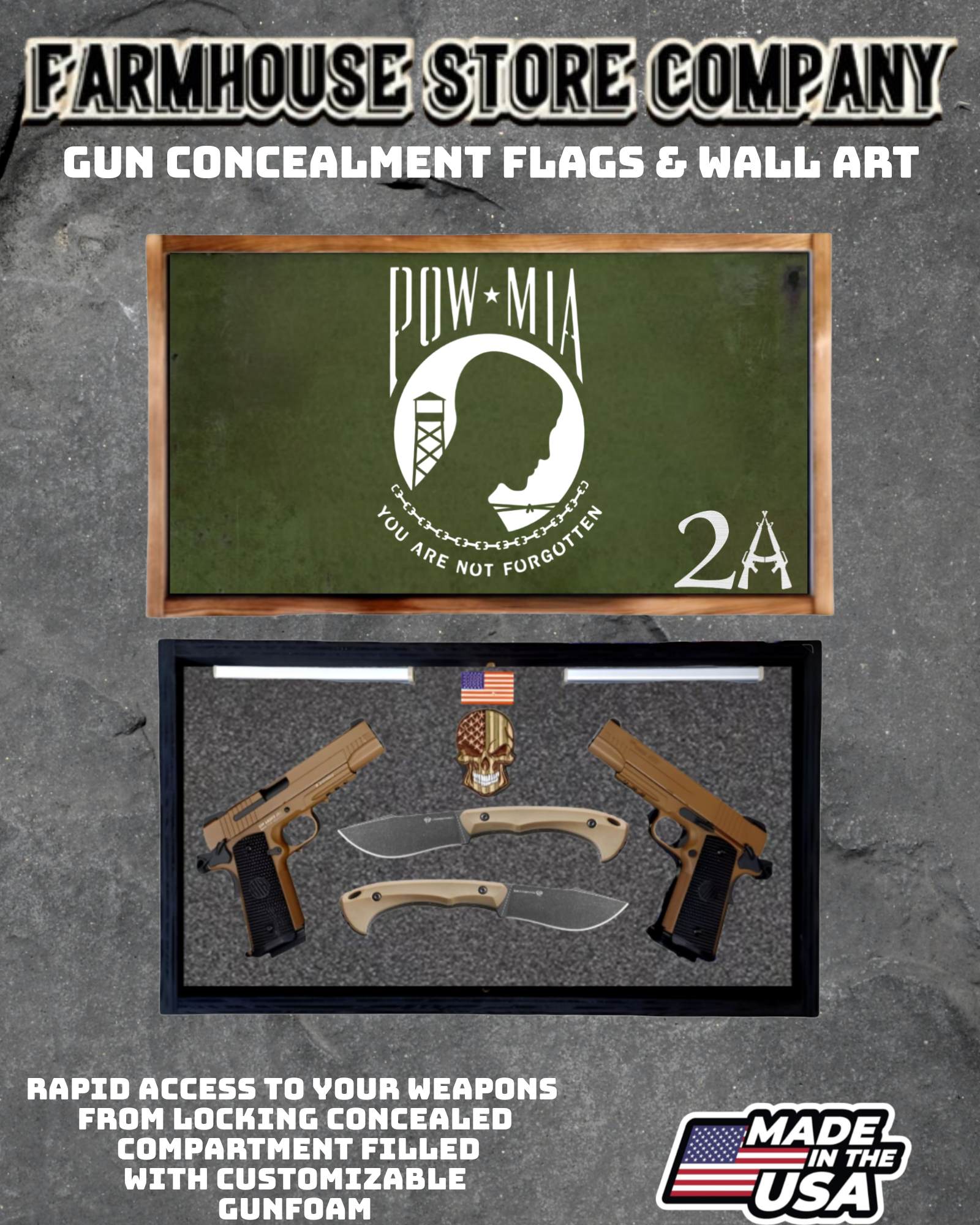 Complete secure concealment of your primary home defense weapons behind an amazing piece of American made Patriotic Decor . This premium Concealment Flag Wall Art keeps your weapons safely out of sight and available within a moment's notice when necessary.