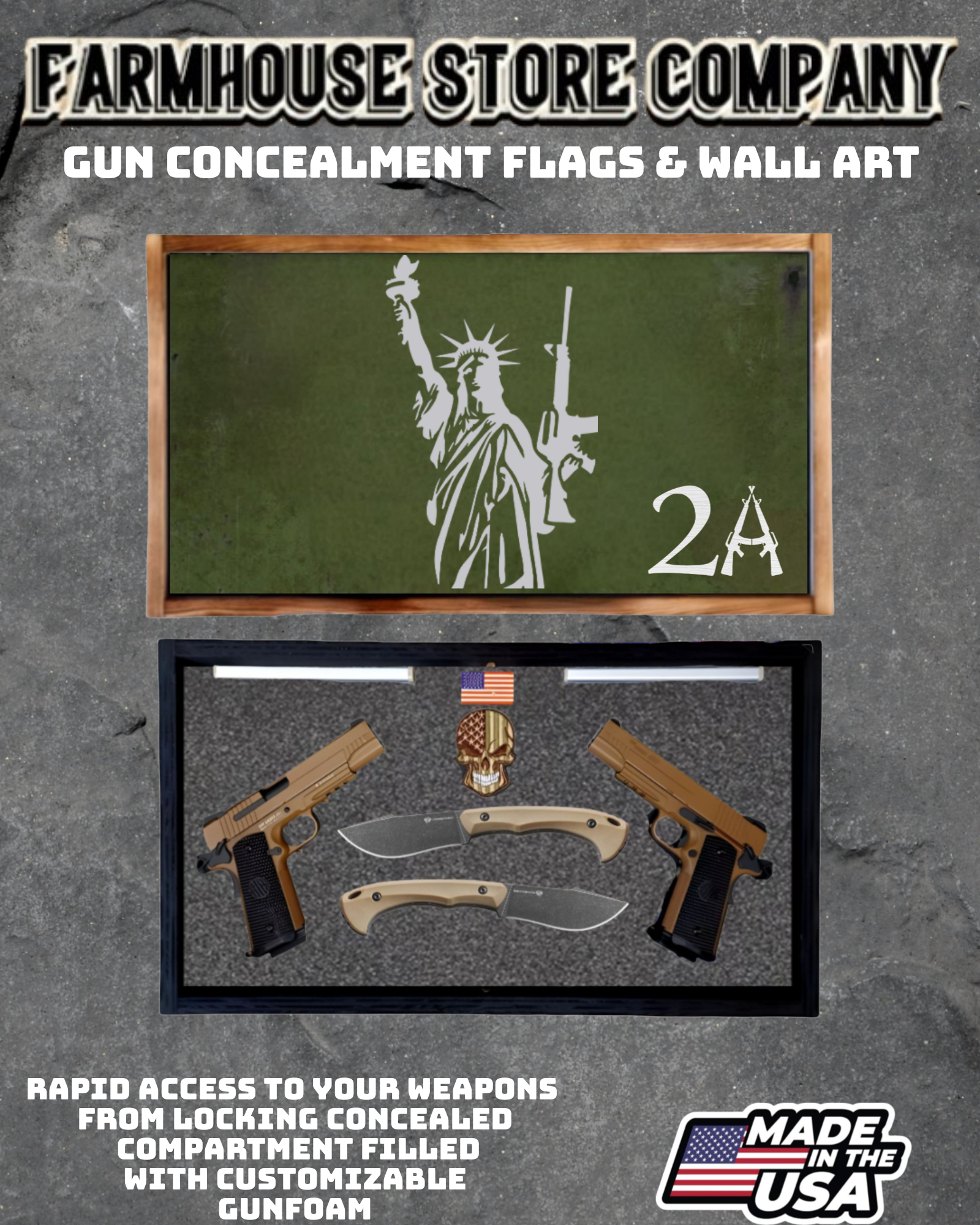 Complete secure concealment of your primary home defense weapons behind an amazing piece of American made Patriotic Decor . This premium Concealment Flag Wall Art keeps your weapons safely out of sight and available within a moment's notice when necessary.