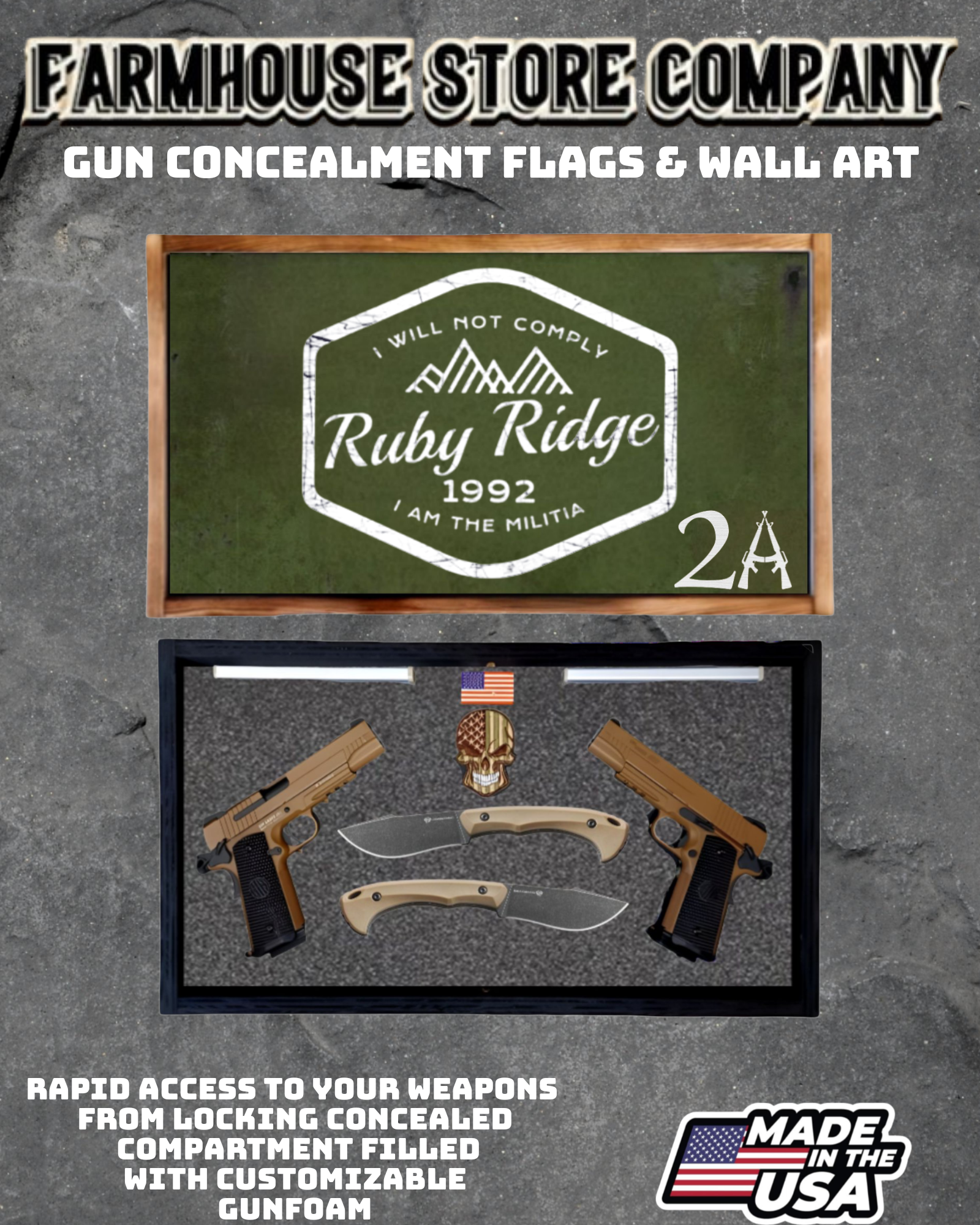 Complete secure concealment of your primary home defense weapons behind an amazing piece of American made Patriotic Decor . This premium Concealment Flag Wall Art keeps your weapons safely out of sight and available within a moment's notice when necessary.