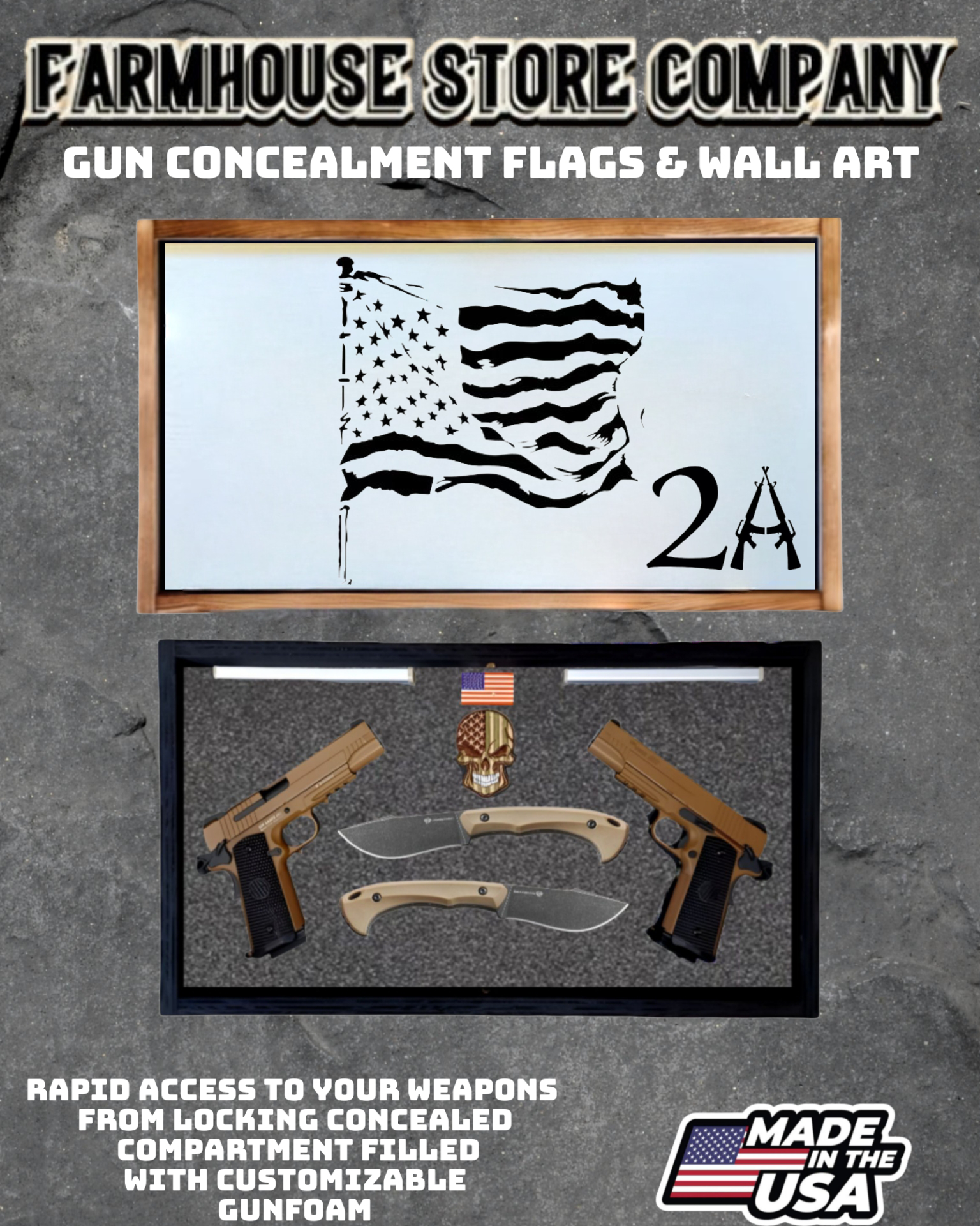 Complete secure concealment of your primary home defense weapons behind an amazing piece of American made Patriotic Decor . This premium Concealment Flag Wall Art keeps your weapons safely out of sight and available within a moment's notice when necessary.