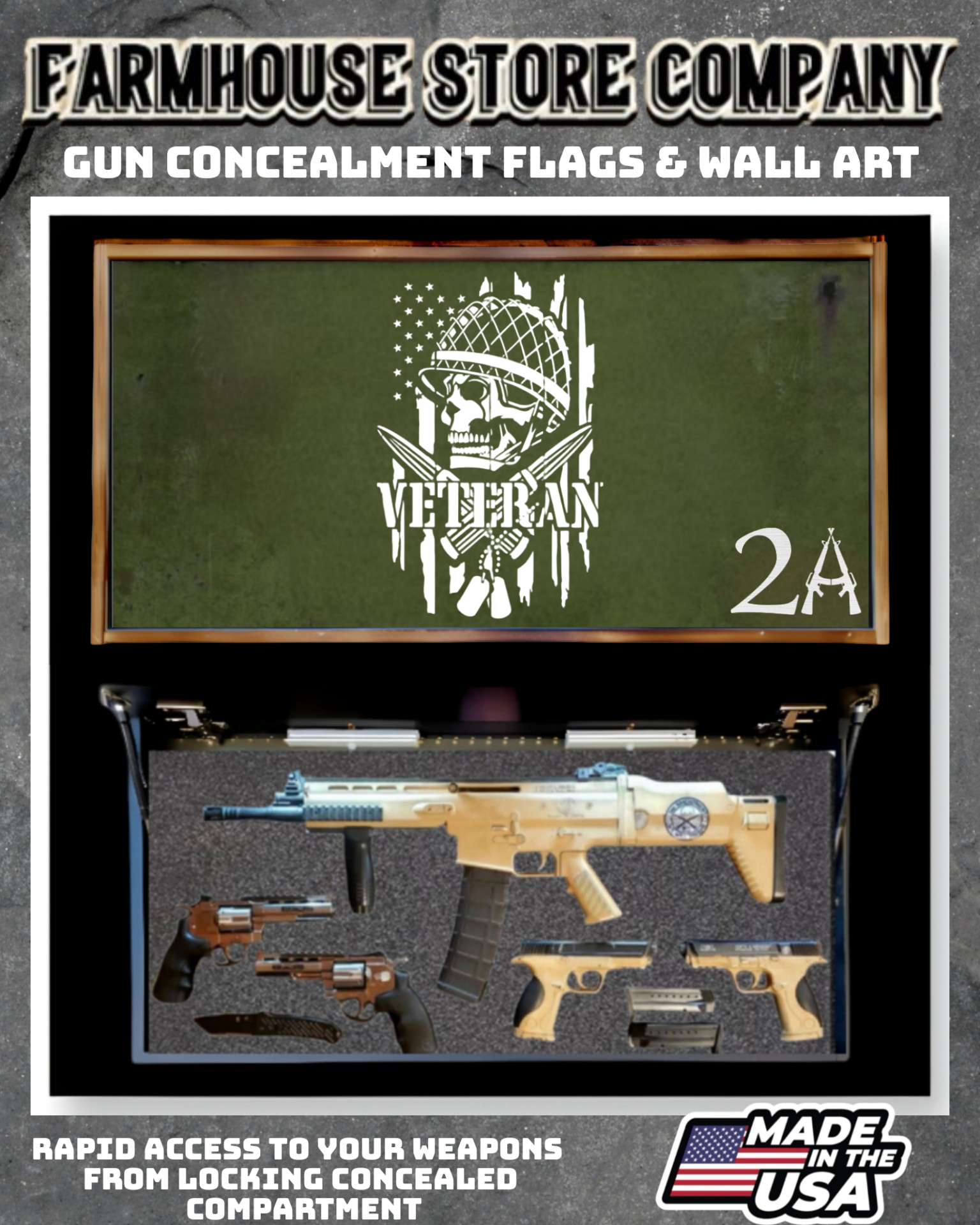 Complete secure concealment of your primary home defense weapons behind an amazing piece of American made Patriotic Decor . This premium Concealment Flag Wall Art keeps your weapons safely out of sight and available within a moment's notice when necessary.