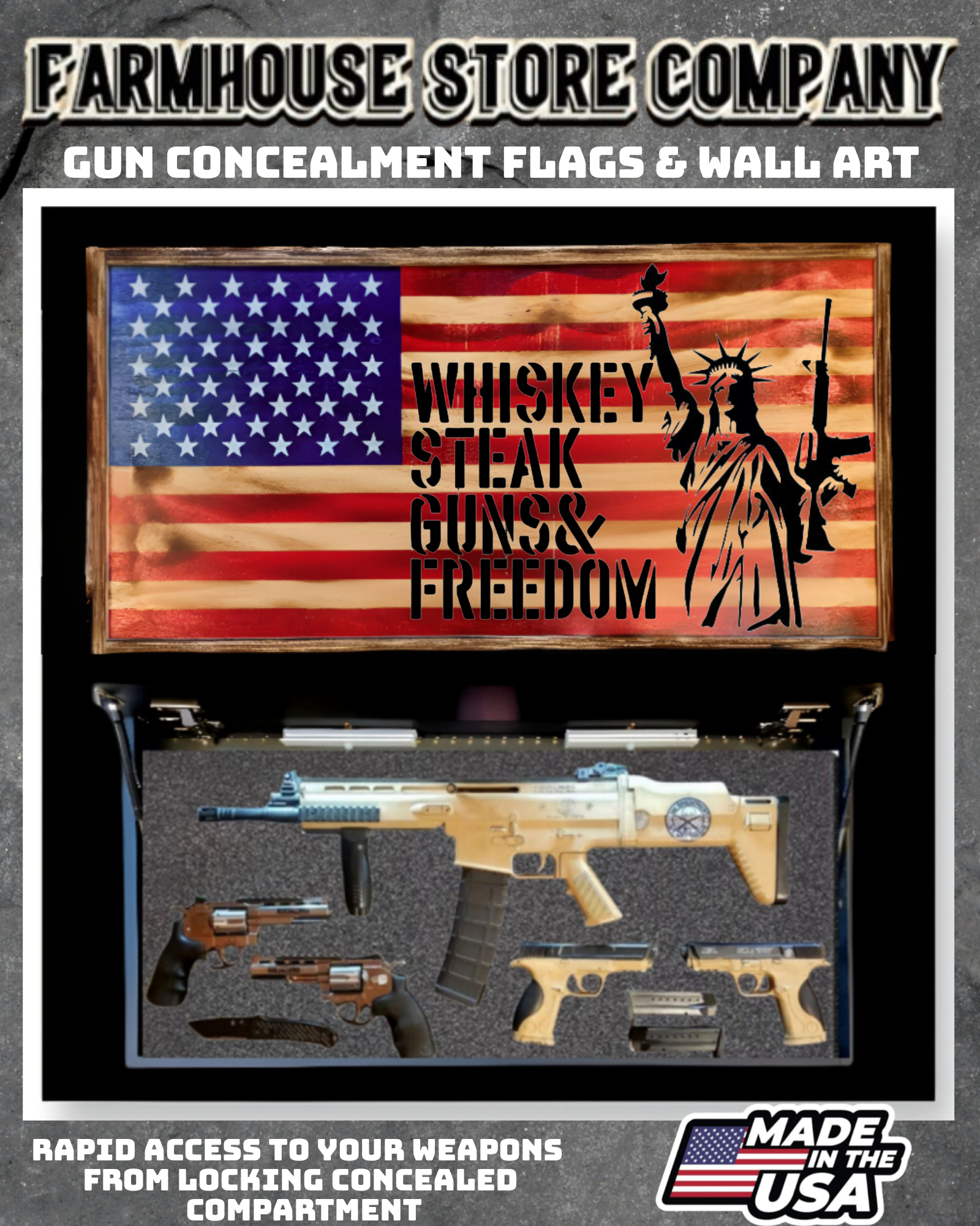 Complete secure concealment of your primary home defense weapons behind an amazing piece of American made Patriotic Decor . This premium Concealment Flag Wall Art keeps your weapons safely out of sight and available within a moment's notice when necessary.