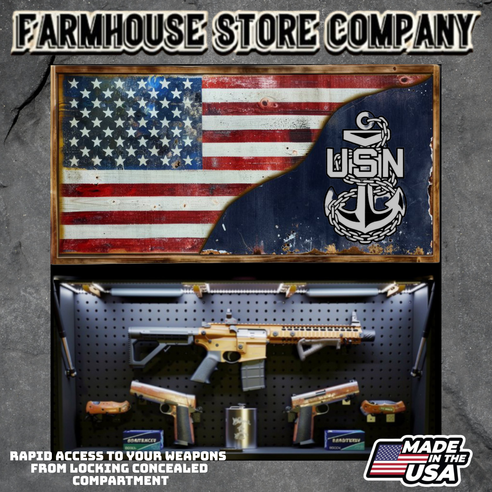 Complete secure concealment of your primary home defense weapons behind an amazing piece of American made Patriotic Decor . This premium Concealment Flag Wall Art keeps your weapons safely out of sight and available within a moment's notice when necessary.