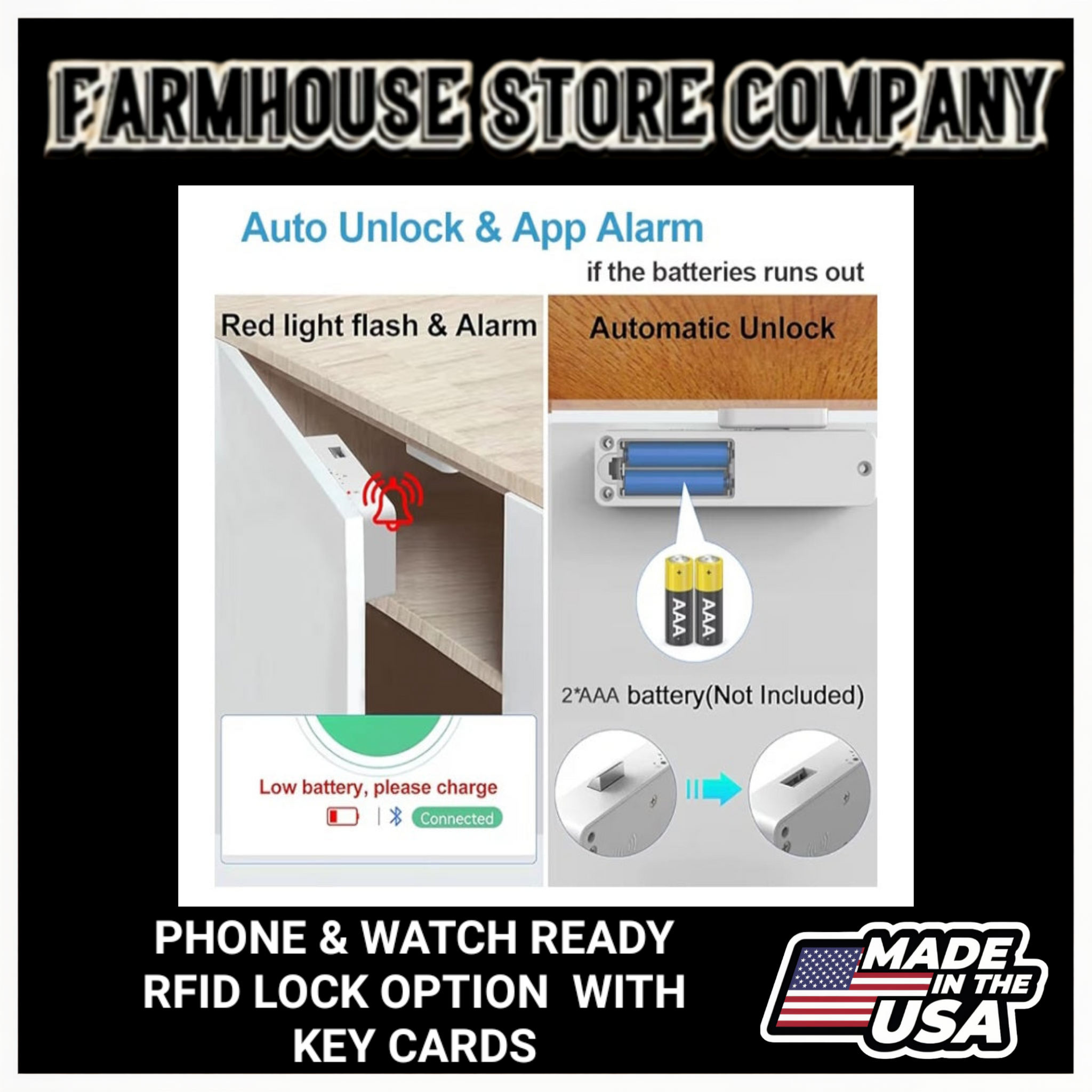 * Choice of a Preinstalled completely Concealed magnetic locking mechanism with *One magnetic key or a RFID Locking system with key cards that is phone & watch ready.