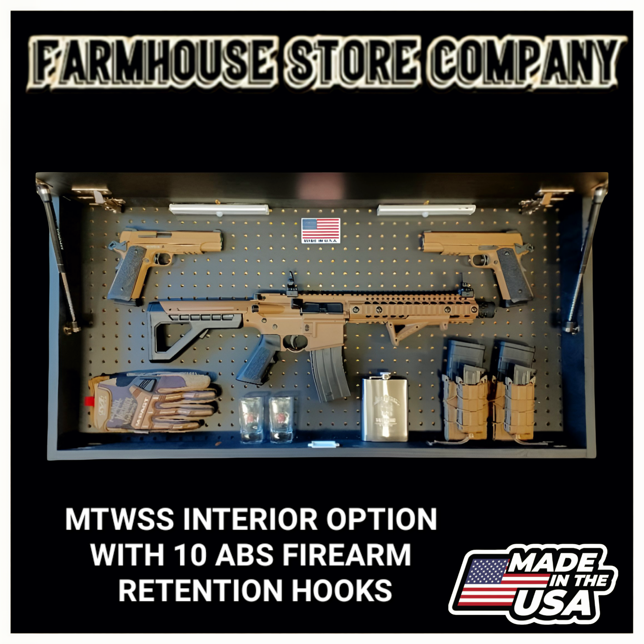 Our Modular Tactical Weapons Storage System (MTWSS) allows the operator more weapons storage and organizational options then ANY other Concealment manufacturer's product that is currently on the market. Once you have mounted this Attractive Rendition of the American Flag/Wall Art, you can customize the MTWSS. Within seconds you can start installing your weapons just the way you want. We also include 10 ABS Weapon Retention Hooks (enough for 5 weapons) These will allow you to organize multiple handguns, rifles, and accessories in the most ergonomic positions you desire while keeping them securely in place when not in use.