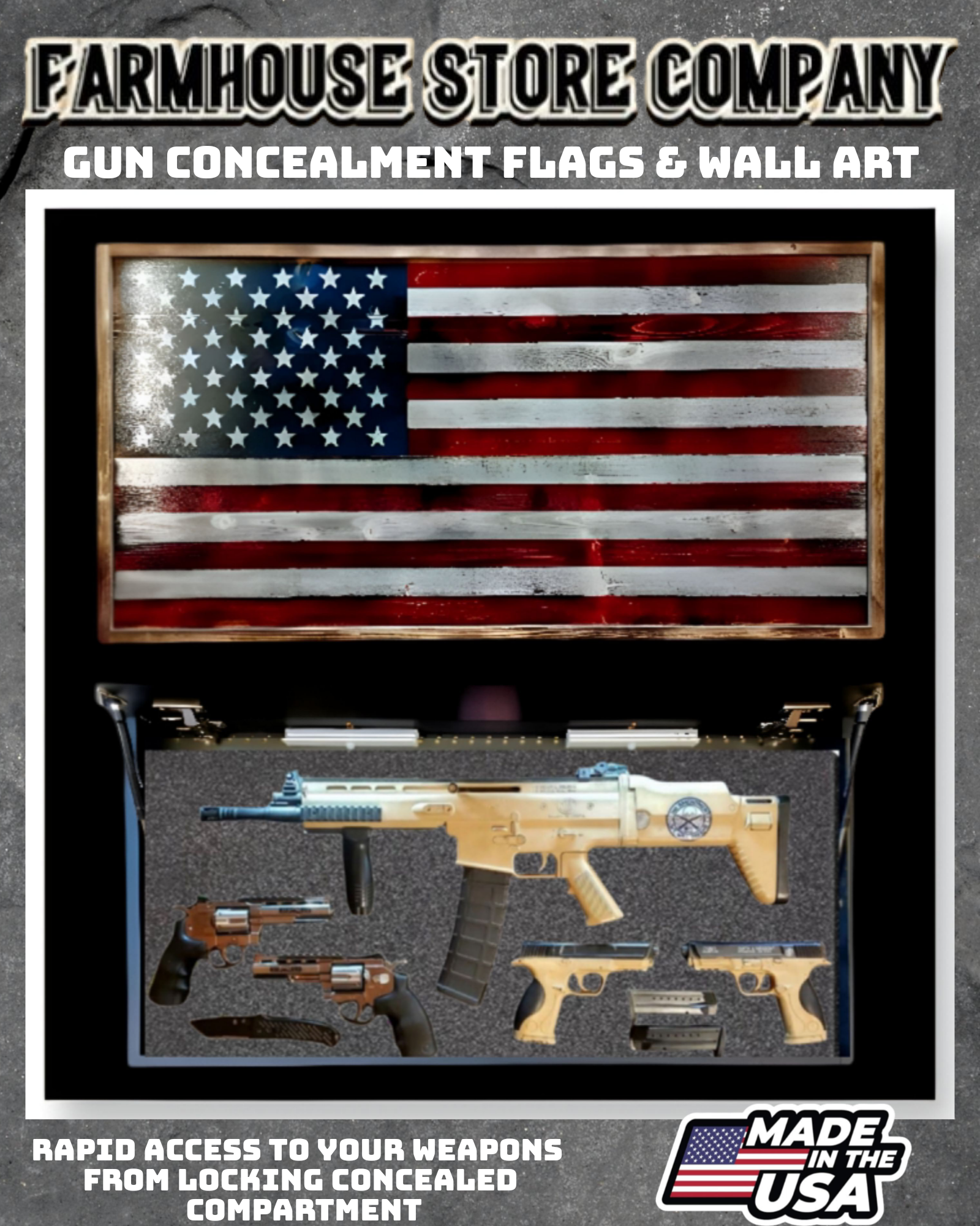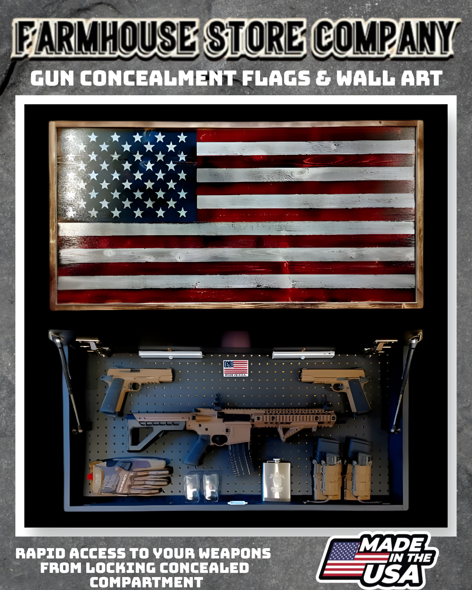 Complete secure concealment of your primary home defense weapons behind an amazing piece of American made Patriotic Decor . This premium Concealment Flag Wall Art keeps your weapons safely out of sight and available within a moment's notice when necessary.