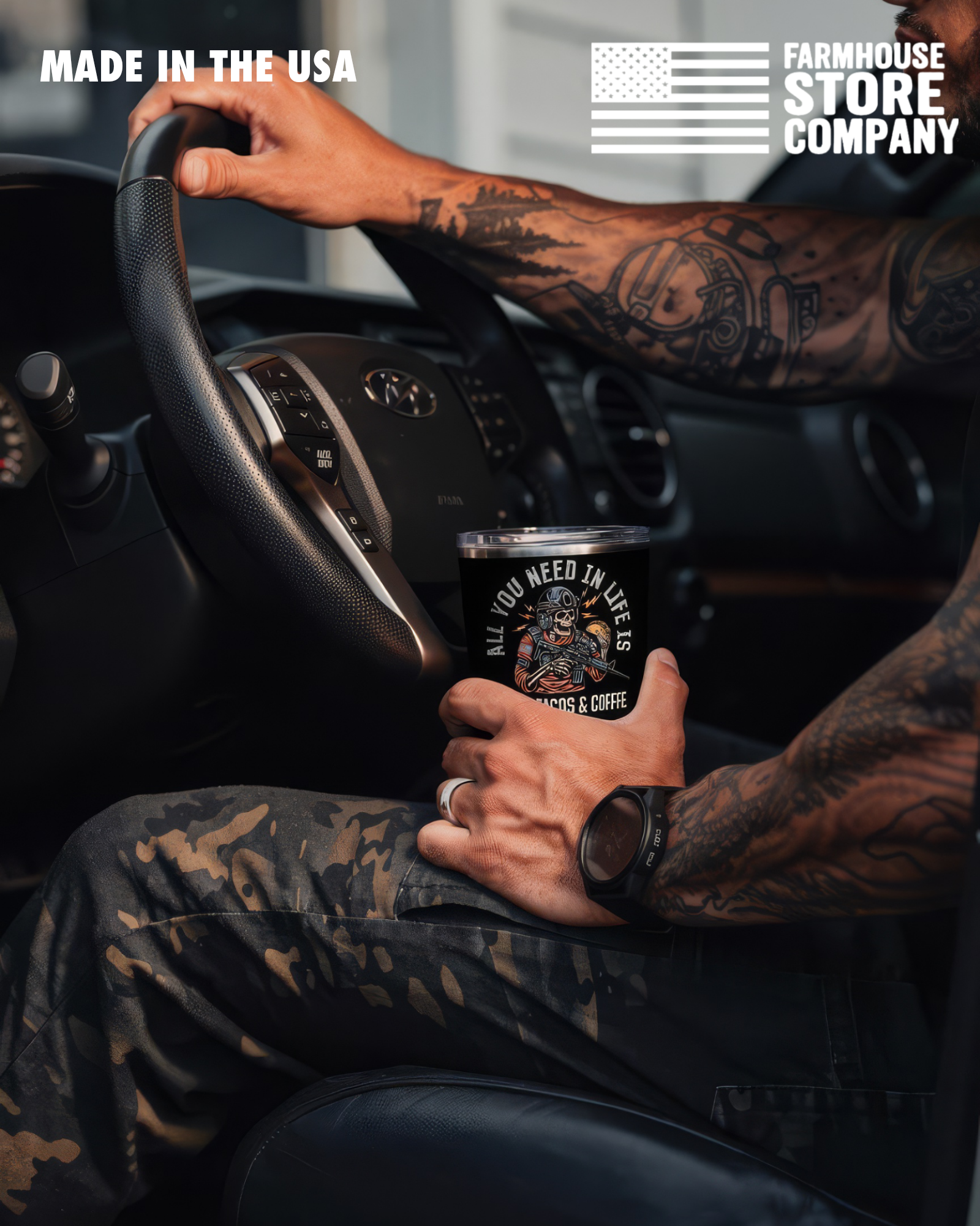 Our Big Fucking Mug (BFM) 12oz Patriotic Mug Tumbler offers a bold statement with its double sided design on a sleek black stainless steel body. Designed for convenience, it features an easy-to-carry handle and a clear, shatter-proof slider lid. Double-wall vacuum insulation keeps your beverage hot or cold for hours, while its compact size fits any standard cup holder. Perfect for those who want durable performance paired with unapologetic attitude.