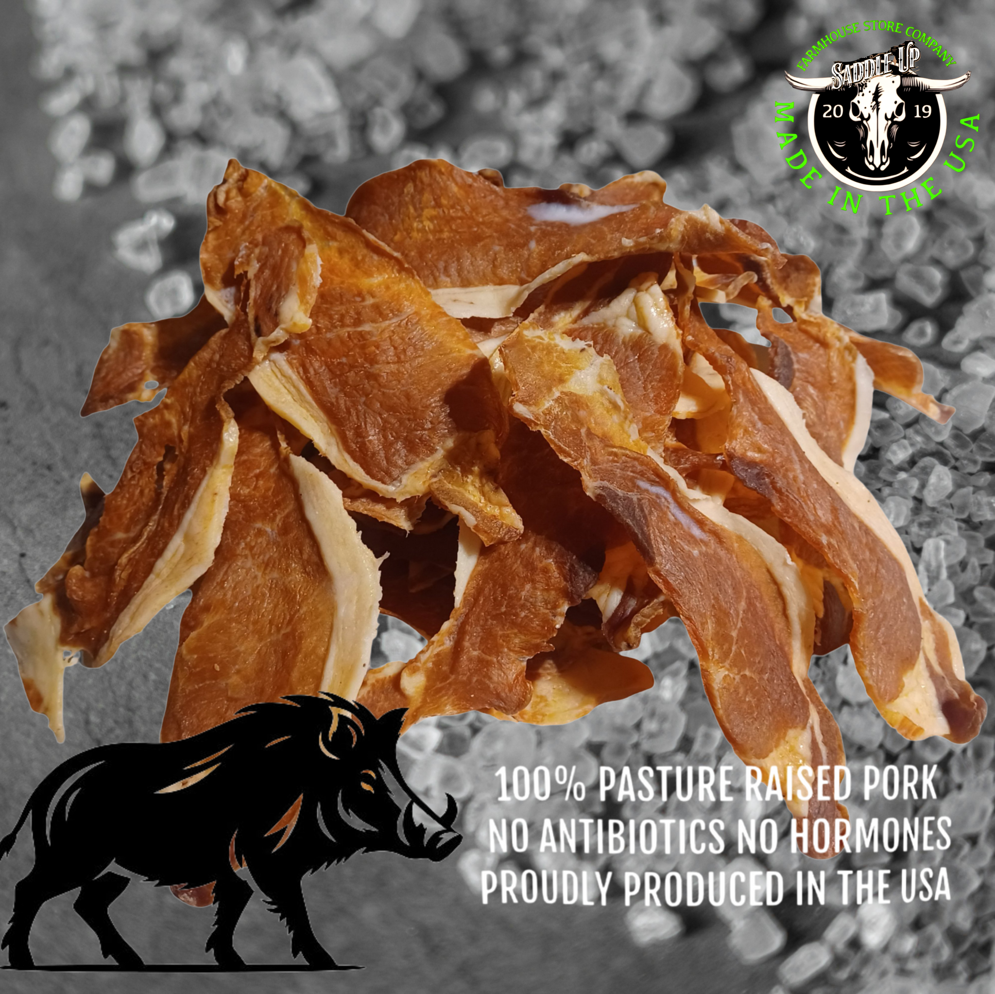 Our Cattle Drive Carnivore Snacks Pork Loin is a tender, savory, and rich snack made from thinly sliced pasture raised pork that has been slow dried to perfection. It is distinct from other types of jerky due to the pork loin cut's higher fat content, which provides a crisp yet buttery, "melt in your mouth" flavor and texture!!